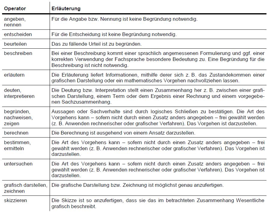 Im Folgenden werden Operatoren erläutert, die in Aufgaben für das Fach Mathematik häufig vorkommen. Die genannten Operatoren werden in den Aufgaben der Aufgabensammlung und des Abituraufgabenpools der jeweiligen Erläuterung entsprechend verwendet. Sie können durch Zusätze (z. B. „rechnerisch“ oder „grafisch“) konkretisiert werden. Zugelassene Hilfsmittel dürfen zur Bearbeitung verwendet werden, sofern dem kein entsprechender Zusatz entgegensteht.